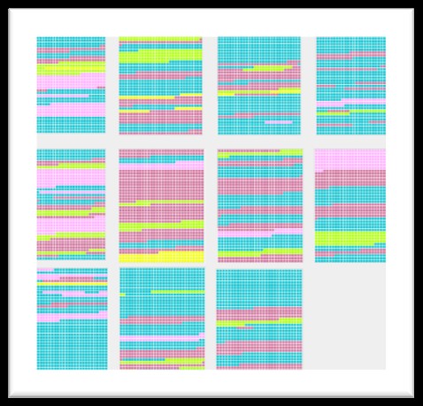 Die Darstellung auf Abbildung 5 zeigt die elf Profilportraits der interviewten Dozierenden, eingefärbt in den Farben der Lehr-Mindsets: blau steht für die Instruktion, grün für das Selbsterkennen der Studierenden, lila für den Dialog, pink für die Begegnung und gelb markiert die geforderte Positionierung. Die gezeigten Profilportraits wurden von MAXQDA mit dem entsprechenden Instrument über die Kodierung erstellt.